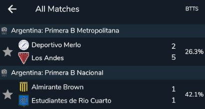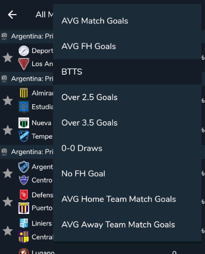 When viewing matches available in the matches tab, all games will have a percentage value next to them. This value is determined by the dropdown selection tool found at the top of screen which allows you to choose a common betting market. The system will calculate the percentage of that occurence of that outcome based on both teams last 10 games combined. It's simply a quick tool to allow you to gauge whether a game may be worth looking into in more detail.