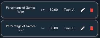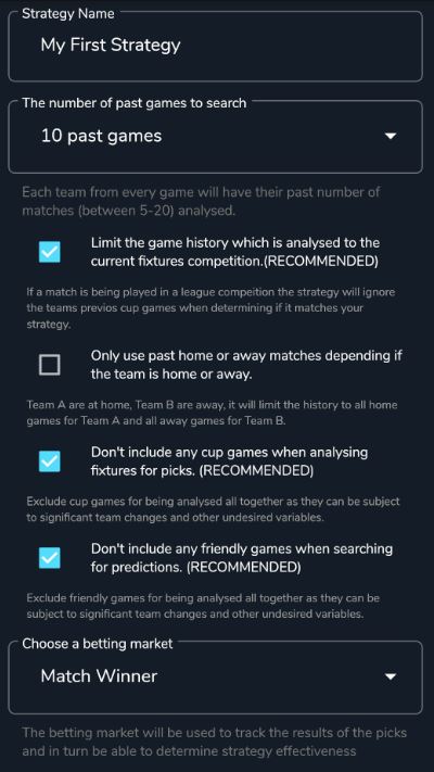 Thresholds allow you to fully control the conditions on your strategy and how matches are analysed against your strategy, you can be either as simple or complex as you'd like. The results of the picks found for your strategy will determine its successfulness and if something isn't working you can tweak the thresholds or add additional etc. One important note, when using Team A or Team B as the team for the threshold condition, the system will use Team A as the Match Winner(if your strategy needs a match winner) so in regards to the example above Team A needs to have won 80% of their previous matches. So Team A from the fixture will be selected at the match winner outcome for the pick.